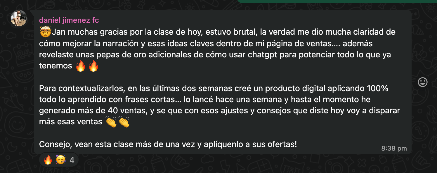 Tendrás mi acompañamiento directo durante los 3 días en vivo, mi método completo y ejemplos reales para que puedas crear mensajes que funcionan como un espejo: reflejan exactamente lo que tu cliente ya siente.